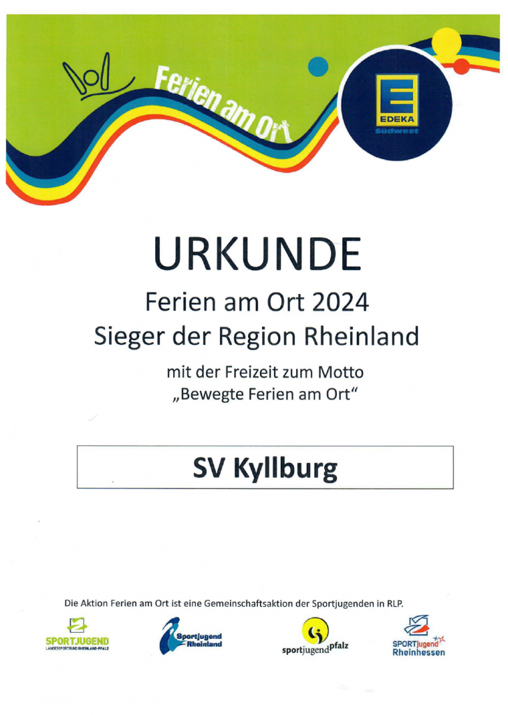 Am Montag, 28.10.2024 überreichte Silvia Lenz-Jardin als Jurymitglied von Ferien am Ort der Sportjugend dem SVK als Regionalsieger eine Urkunde, sowie einen Scheck in Höhe von 100 Euro als Anerkennung für eine gelungene Ferienfreizeit unter dem Motto: „Bewegte Ferien am Ort“.